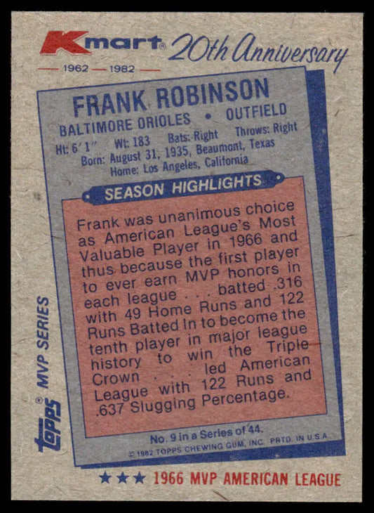 1982 Topps Kmart 20th Anniversary #9 Frank Robinson EX/NM Baltimore Orioles Baseball Card