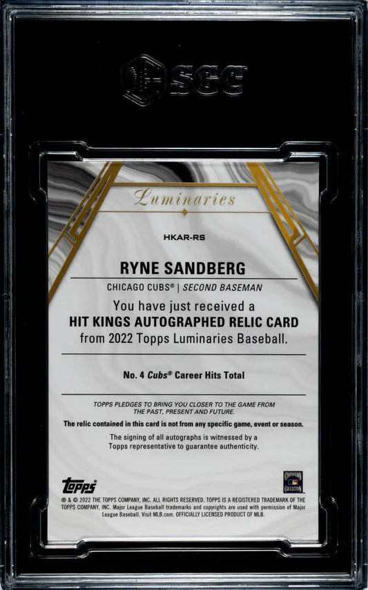 2022 Topps Luminaries #HKAR-RS Ryne Sandberg SGC 9.5 MINT+ MEM Auto 10/10 Chicago Cubs Baseball Card