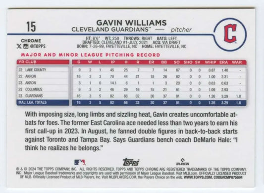 2024 Topps Chrome #15 Gavin Williams NM-MT RC Rookie Cleveland Guardians Baseball Card
