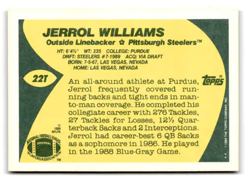 1989 Topps Traded #22T Jerrol Williams NM Near Mint RC Rookie Steelers ID:73677