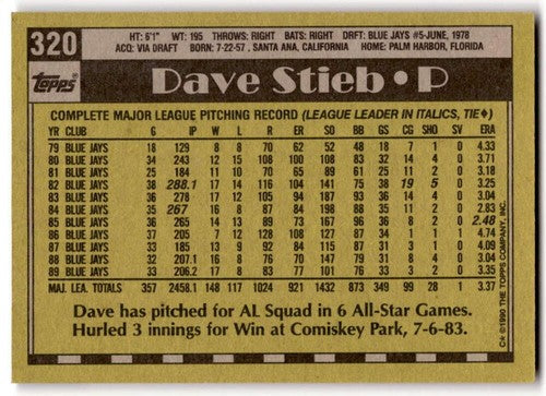 1990 Topps #320 Dave Stieb NM Near Mint Blue Jays ID:43450