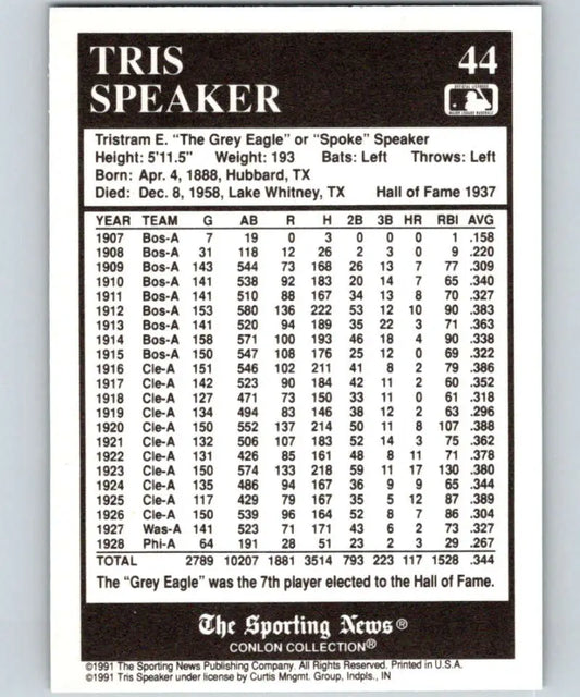 1991 Conlon Collection #44 Tris Speaker EX Excellent Cleveland Indians Baseball Card