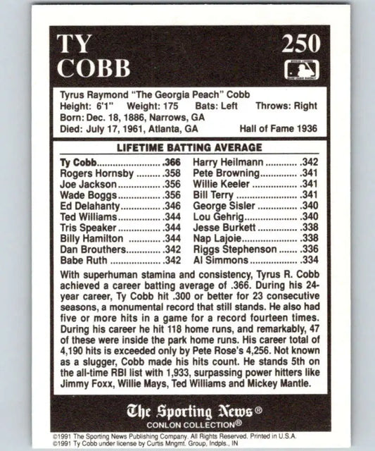 1991 Conlon Collection #250 Ty Cobb EX Excellent Philadelphia Athletics Baseball Card