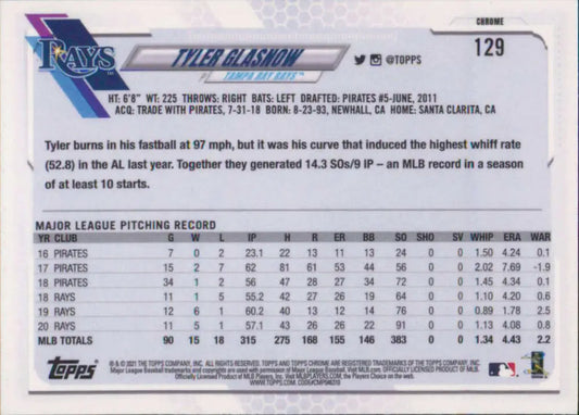 2021 Topps Chrome #129 Tyler Glasnow NM-MT Tampa Bay Rays Baseball Card
