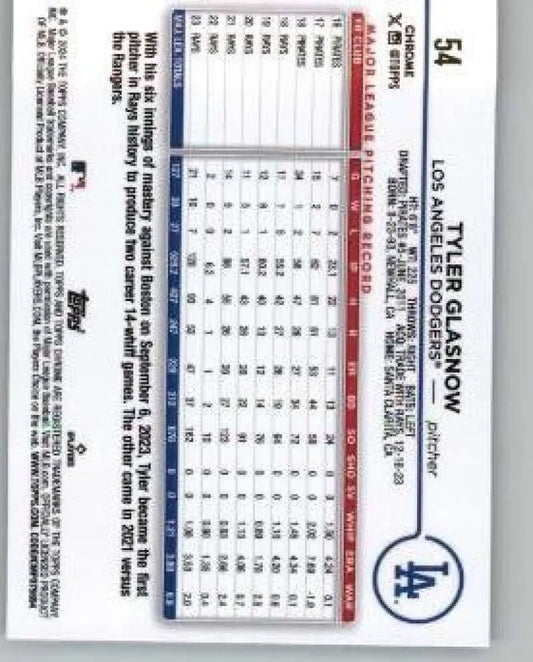 2024 Topps Chrome Refractor Negative #54 Tyler Glasnow NM-MT Los Angeles Dodgers Baseball Card