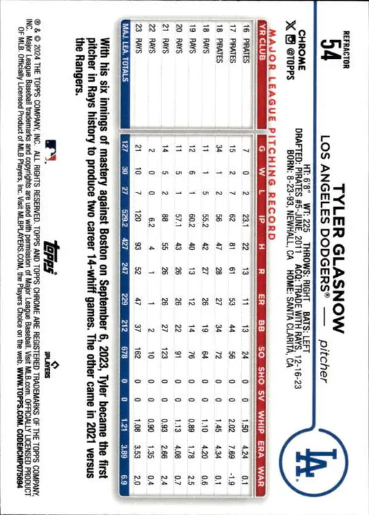 2024 Topps Chrome Refractor #54 Tyler Glasnow NM-MT Los Angeles Dodgers Baseball Card