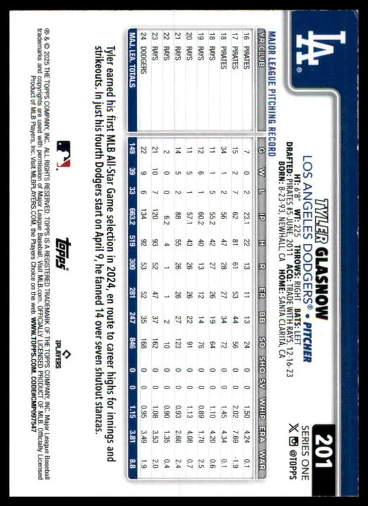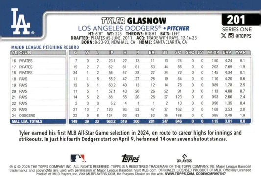 2025 Topps #201 Tyler Glasnow NM-MT Los Angeles Dodgers Baseball Card