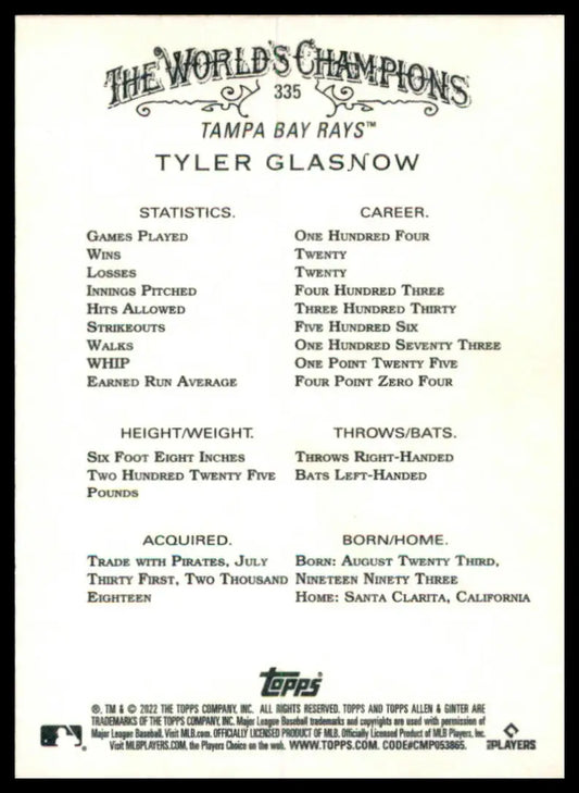 Tyler Glasnow 2022 Topps Allen & Ginter #335 Tampa Bay Rays