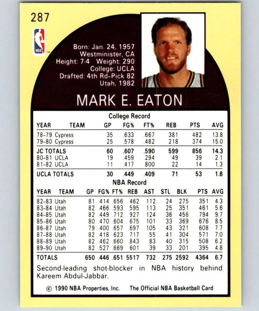 1990-91 Hoops #287 Mark Eaton UER NM-MT Utah Jazz Basketball Card
