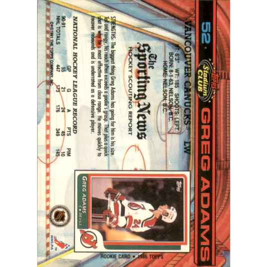 1991-92 Topps Stadium Club #52 Greg Adams NM-MT Vancouver Canucks Hockey Card