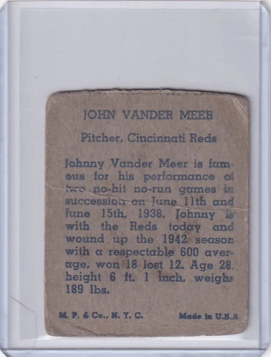 1943 R302-01 M.P. & Co Johnny Vander Meer - Cincinnati Reds