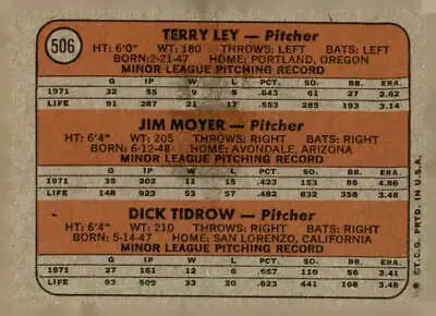 1972 Topps #506 Indians Rookie Stars (Terry Ley / Jim Moyer / Dick Tidrow) EX-MT