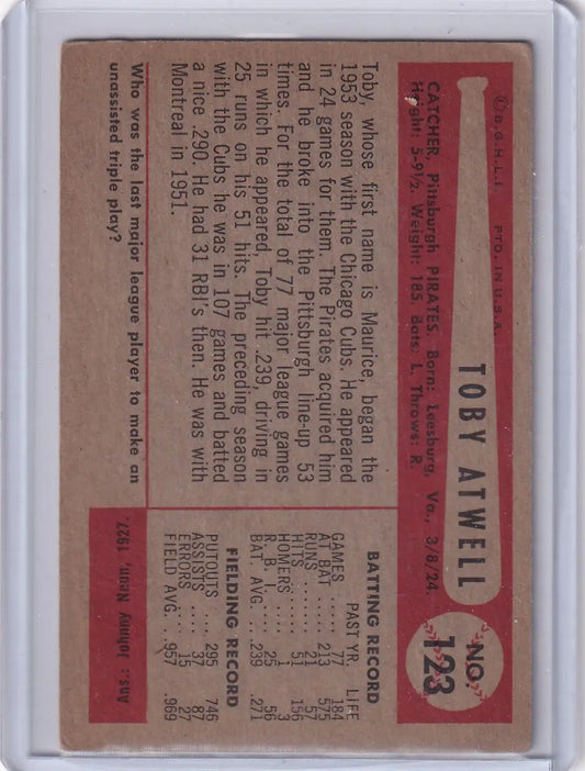 1954 Bowman #123 Toby Atwell - Pittsburgh Pirates