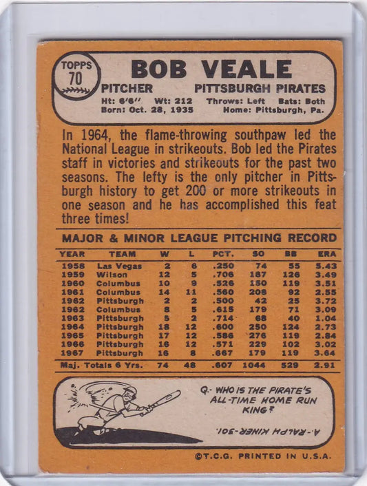 1968 Topps Baseball #70 Bob Veale - Pittsburgh Pirates