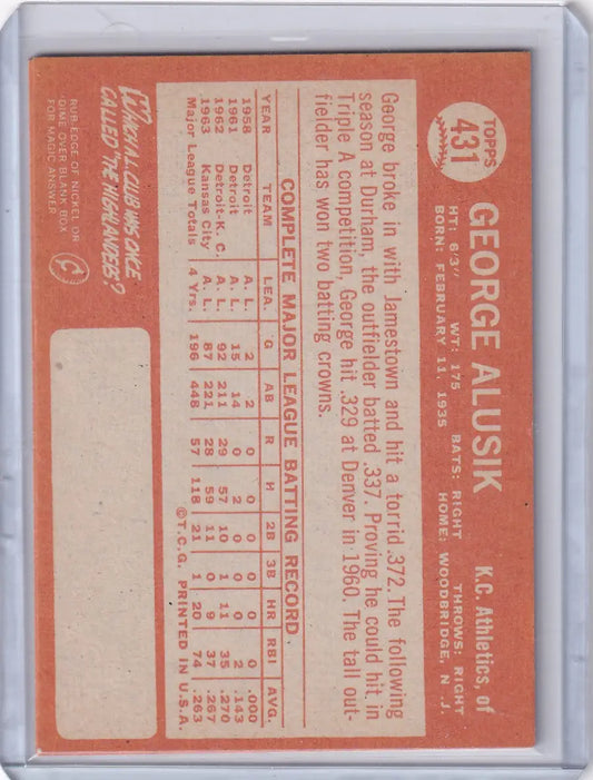 1964 Topps Baseball #431 George Alusik - Kansas City Athletics