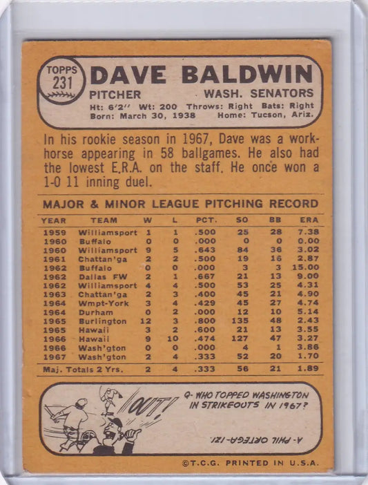 1968 Topps Baseball #231 Dave Baldwin - Washington Senators RC