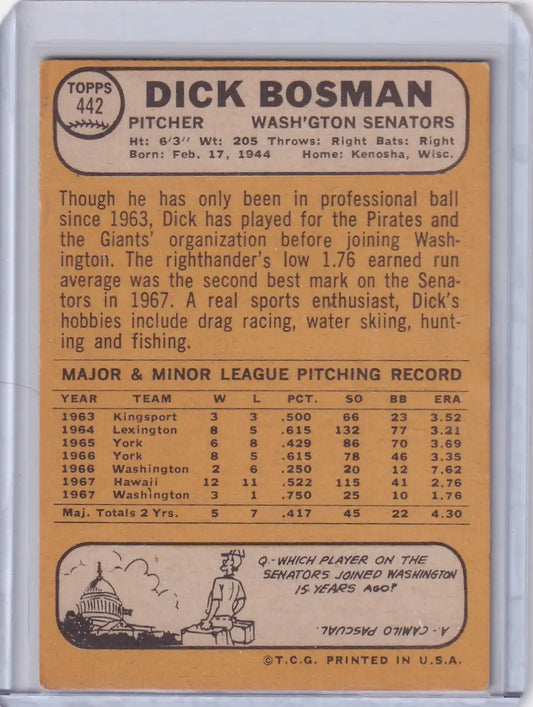 1968 Topps Baseball #442 Dick Bosman - Washington Senators