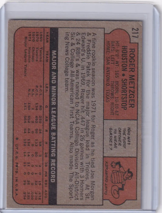 1972 Topps Baseball #217 Roger Metzger - Houston Astros
