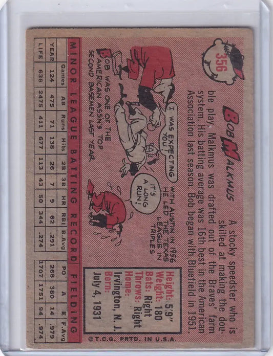 1958 Topps Baseball #356 Bobby Malkmus - Washington Senators RC