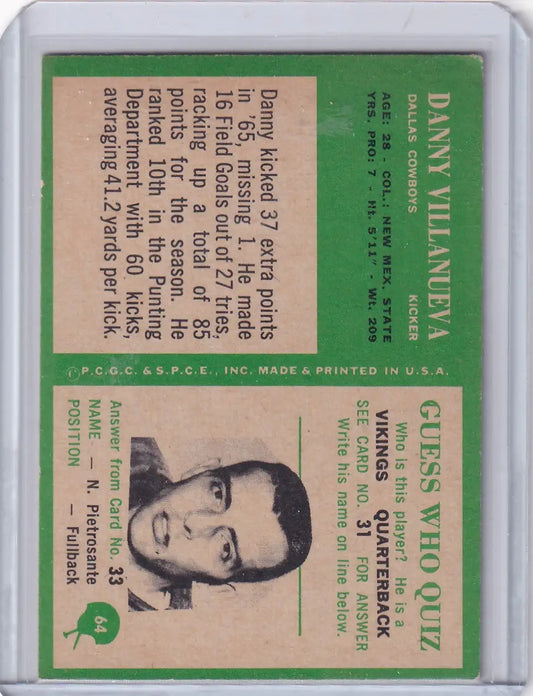 1966 Philadelphia Football #64 Danny Villanueva - Dallas Cowboys