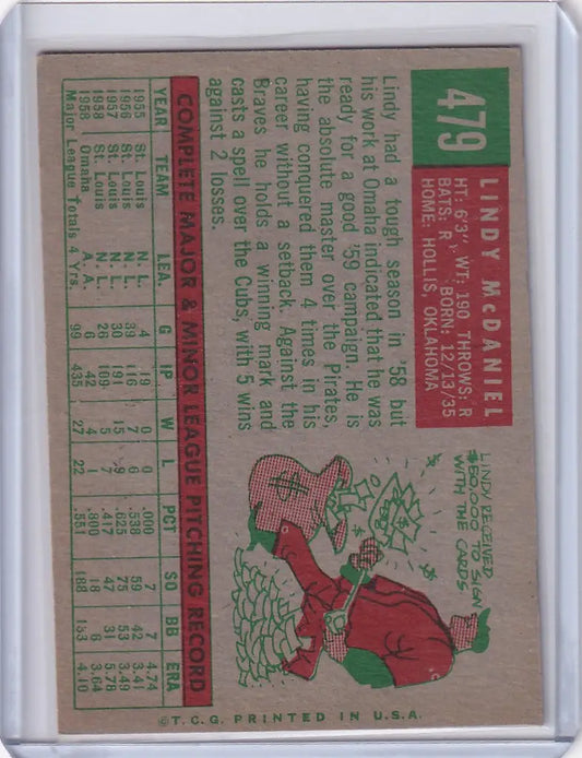 1959 Topps Baseball #479 Lindy McDaniel - St. Louis Cardinals