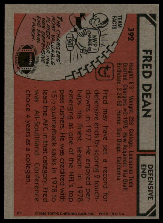 1980 Topps Fred Dean #392 San Diego Chargers Football Card NFL Sports