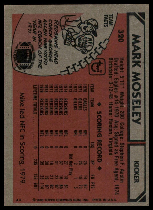 1980 Topps Mark Moseley #320 Washington Redskins Football Card NFL Sports