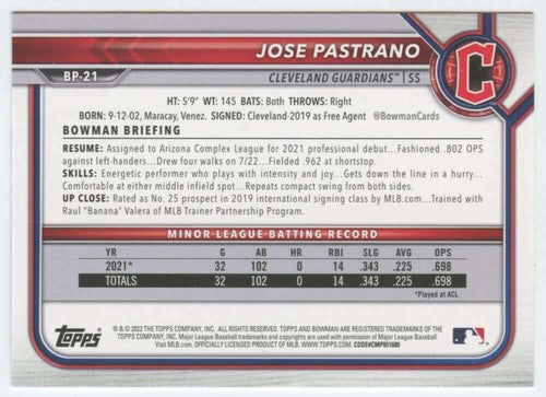 2022 Bowman Prospects #BP-21 Jose Pastrano NM-MT Guardians 1st Bowman ID:41976