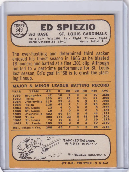 1968 Topps Baseball #349 Ed Spiezio - St. Louis Cardinals