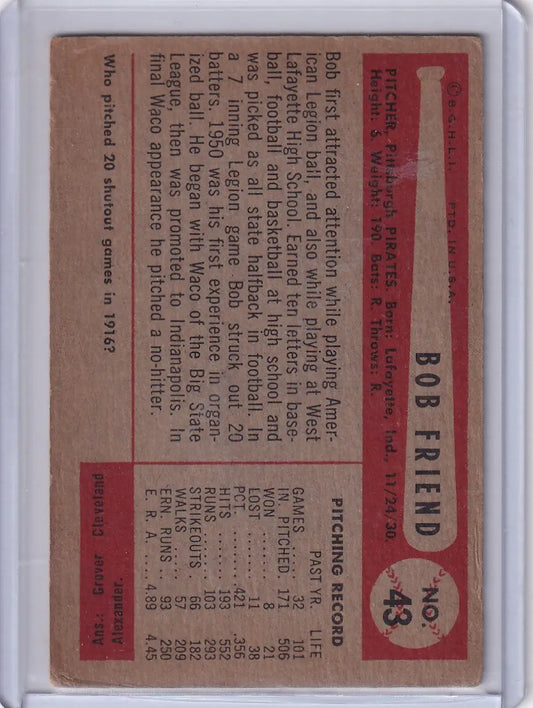 1954 Bowman #43A Bob Friend (20 Shutouts) - Pittsburgh PiratesRegular price $17.25 USDRegular priceUnit price / per-