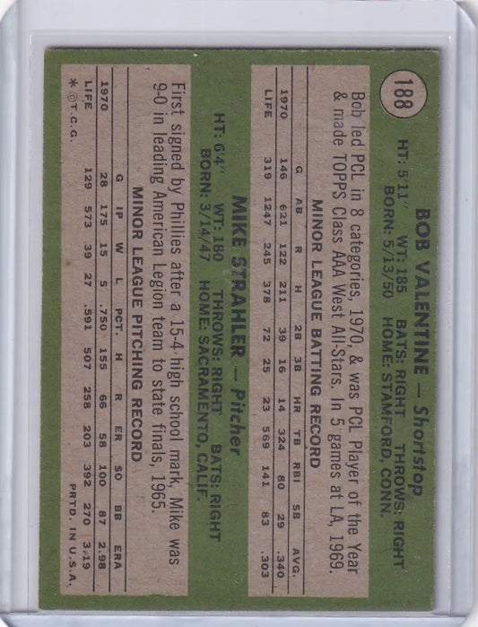 1971 Topps Baseball #188 Dodgers Rookies - Bobby Valentine / Mike Strahler RC