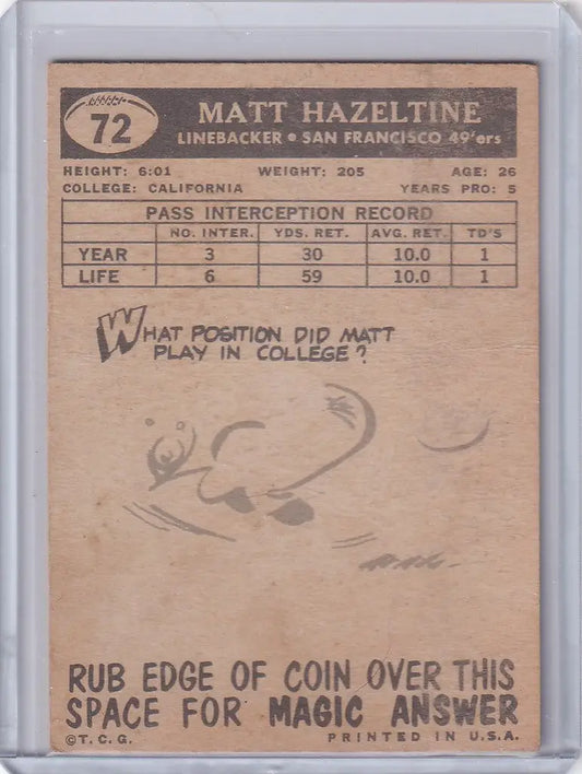 1959 Topps Football # 72 Matt Hazeltine - San Francisco 49ers