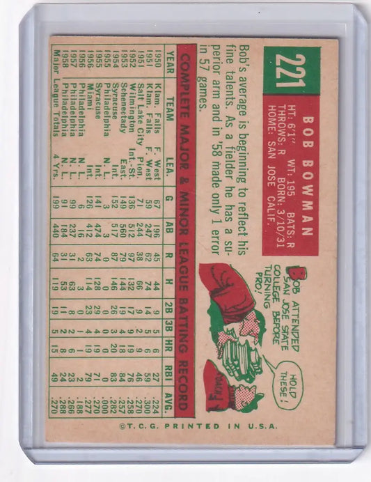1959 Topps 221 Bob Bowman - Philadelphia Phillies