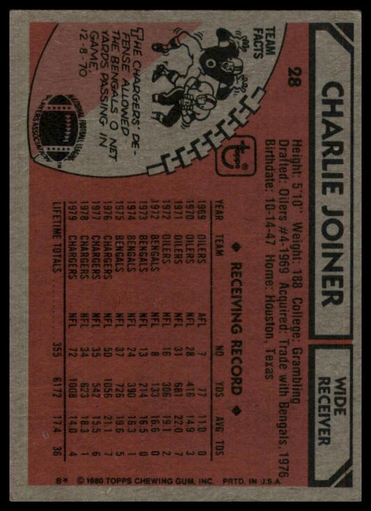 1980 Topps Charlie Joiner #28 San Diego Chargers Football Card NFL Sports