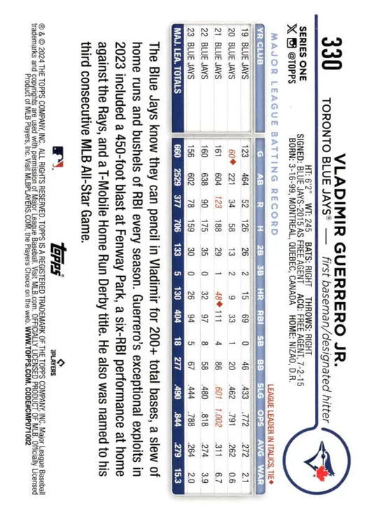 2024 Topps #330 Vladimir Guerrero Jr. NM-MT Toronto Blue Jays Baseball Card