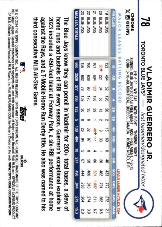 2024 Topps Chrome #78 Vladimir Guerrero Jr. NM-MT Toronto Blue Jays Baseball Card