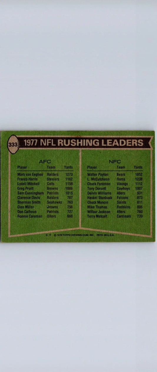 1978 Topps #333 1977 Rushing Leaders (Mark van Eeghen / Walter Payton)