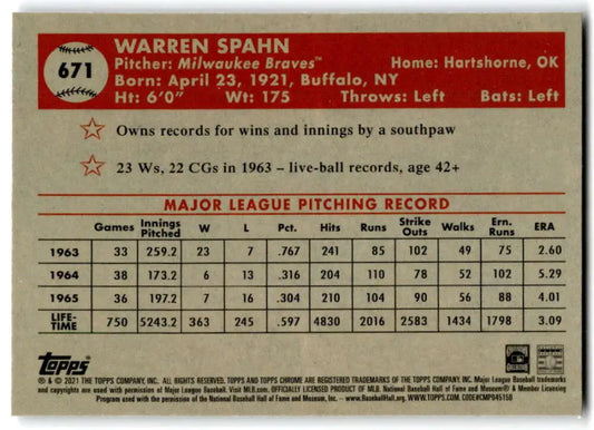 2021 Topps Chrome Platinum Anniversary #671 Warren Spahn NM-MT Milwaukee Braves Baseball Card
