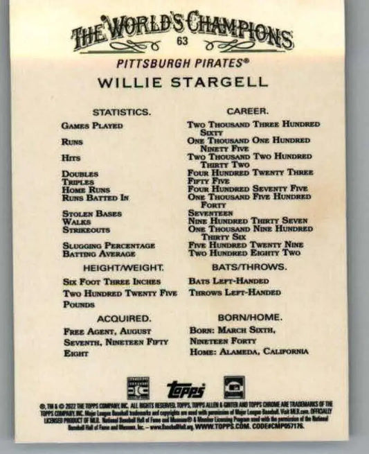 2022 Topps Allen and Ginter Chrome #63 Willie Stargell NM-MT Pittsburgh Pirates Baseball Card