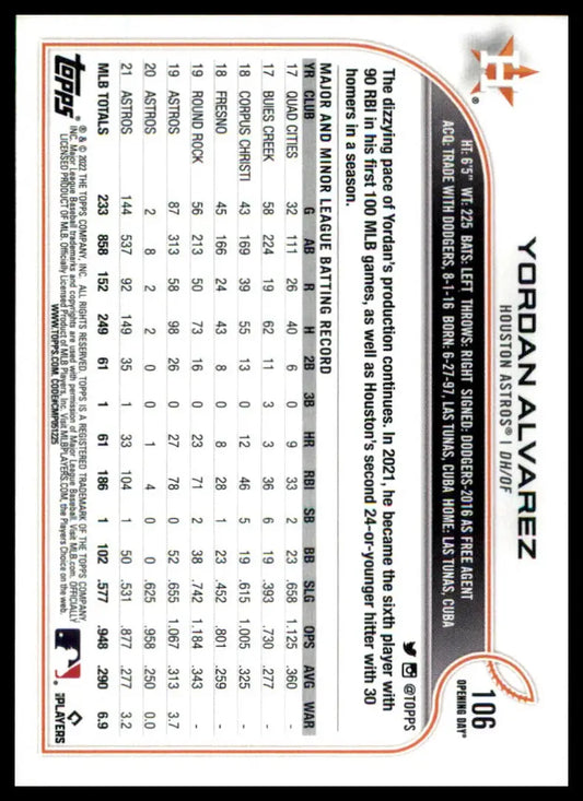 Yordan Alvarez 2022 Topps Opening Day #106 Houston Astros