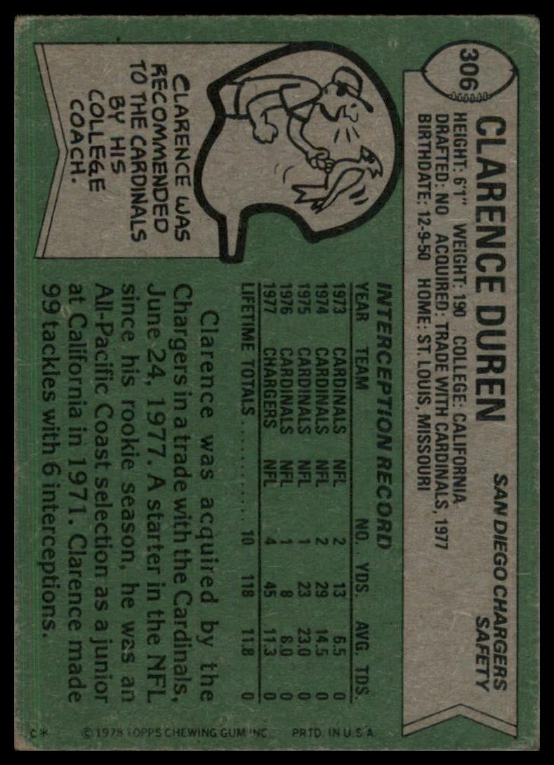 1978 Topps Clarence Duren #306 Rookie San Diego Chargers Football Card NFL Sport