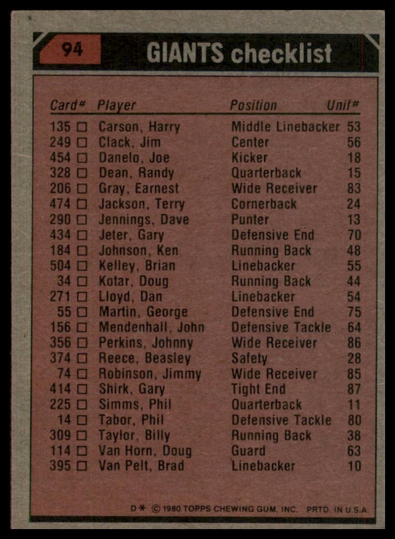 1980 Topps Team Leaders Carson Jackson Martin #94 Rookie New York Giants NFL