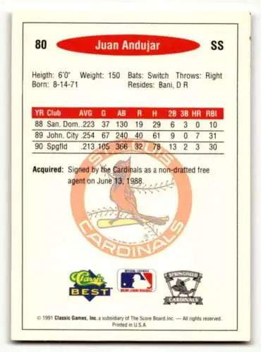 1991 Classic Best #80 Juan Andujar Springfield Cardinals Baseball Ca ID:64358