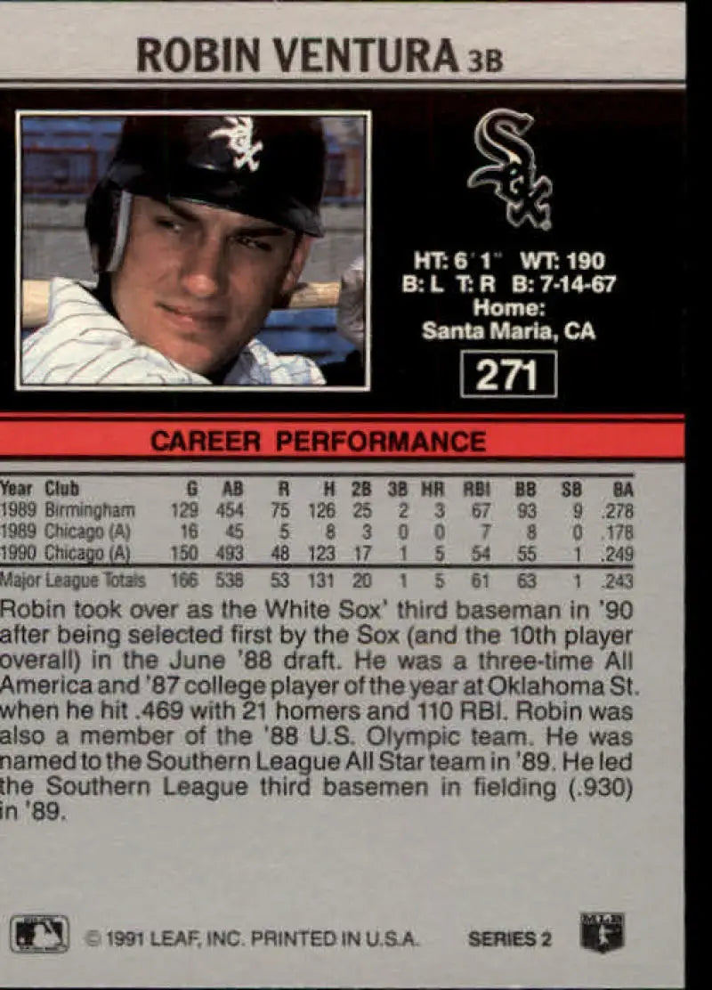 Whether you're a seasoned collector or just starting out, the 1991 Leaf #271 Robin Ventura NM-MT Chicago White Sox Baseball Card is sure to be a prized possession in your collection. Pick up this classic piece of baseball memorabilia today and celebrate the legendary career of Robin Ventura.