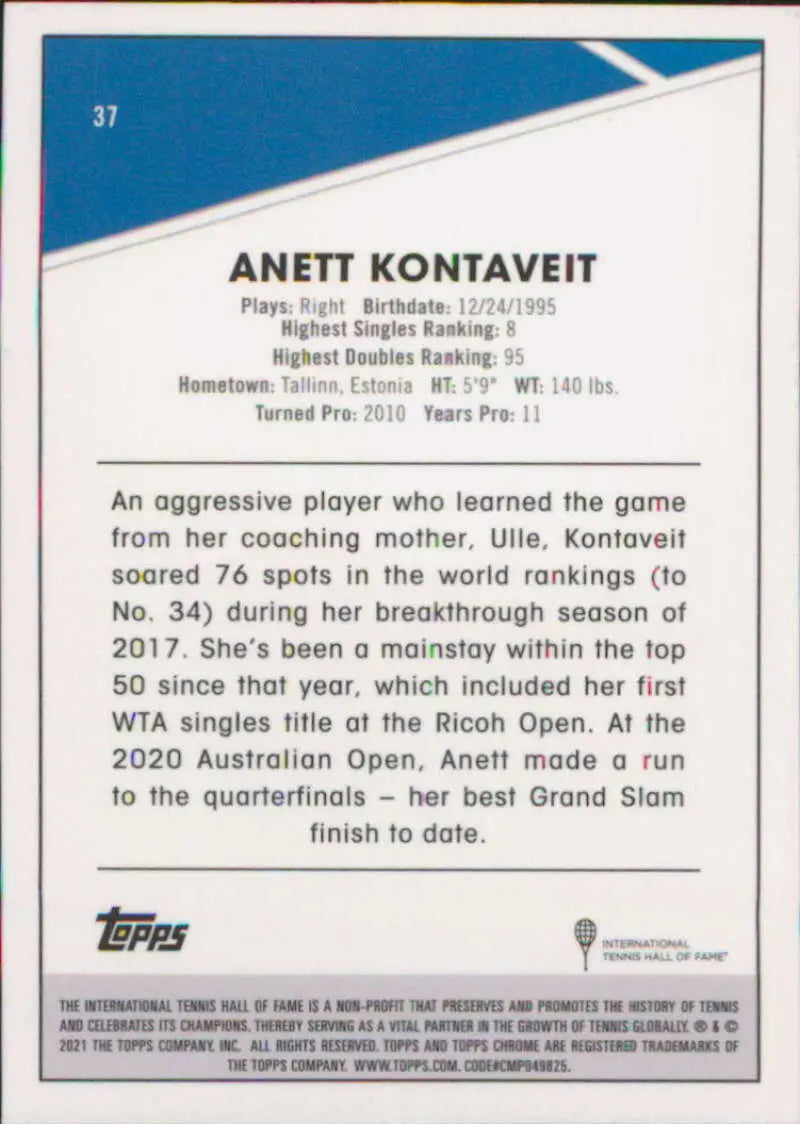 With its sleek chrome finish and vibrant colors, the 2021 Topps Chrome #37 Anett Kontaveit card is sure to stand out in any collection. The front of the card features a striking image of Kontaveit in action, while the back provides essential statistics and information about her career.