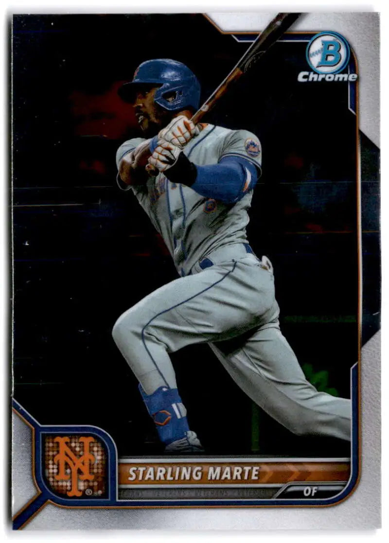 Introducing the highly sought-after 2022 Bowman Chrome #97 Starling Marte NM-MT New York Mets Baseball Card. This premium quality baseball card features Starling Marte, the talented outfielder for the New York Mets. Collectors and fans alike will appreciate the pristine NM-MT (Near Mint to Mint) condition of this card, making it a valuable addition to any baseball card collection.