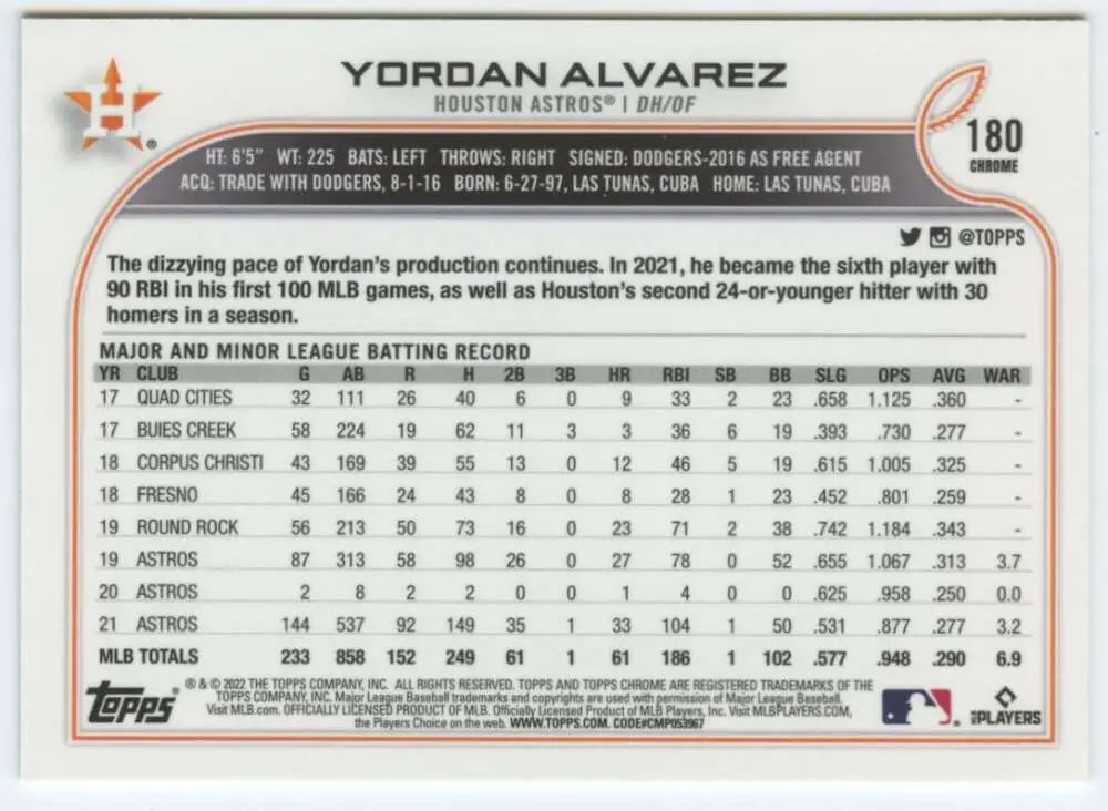 2022 Topps Chrome #180 Yordan Alvarez NM-MT Houston Astros Baseball Card