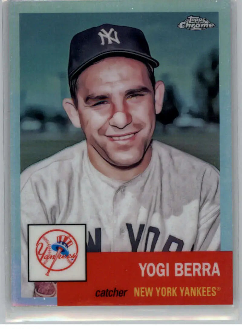 Own a piece of baseball history with the 2022 Topps Chrome Platinum Anniversary Refractor #8 Yogi Berra NM-MT New York Yankees Baseball Card. This rare and highly sought-after card features the legendary Yogi Berra, a Hall of Fame catcher who played for the Yankees from 1946 to 1963. Berra is widely regarded as one of the greatest catchers in the history of baseball, and this card showcases his incredible talent and legacy.