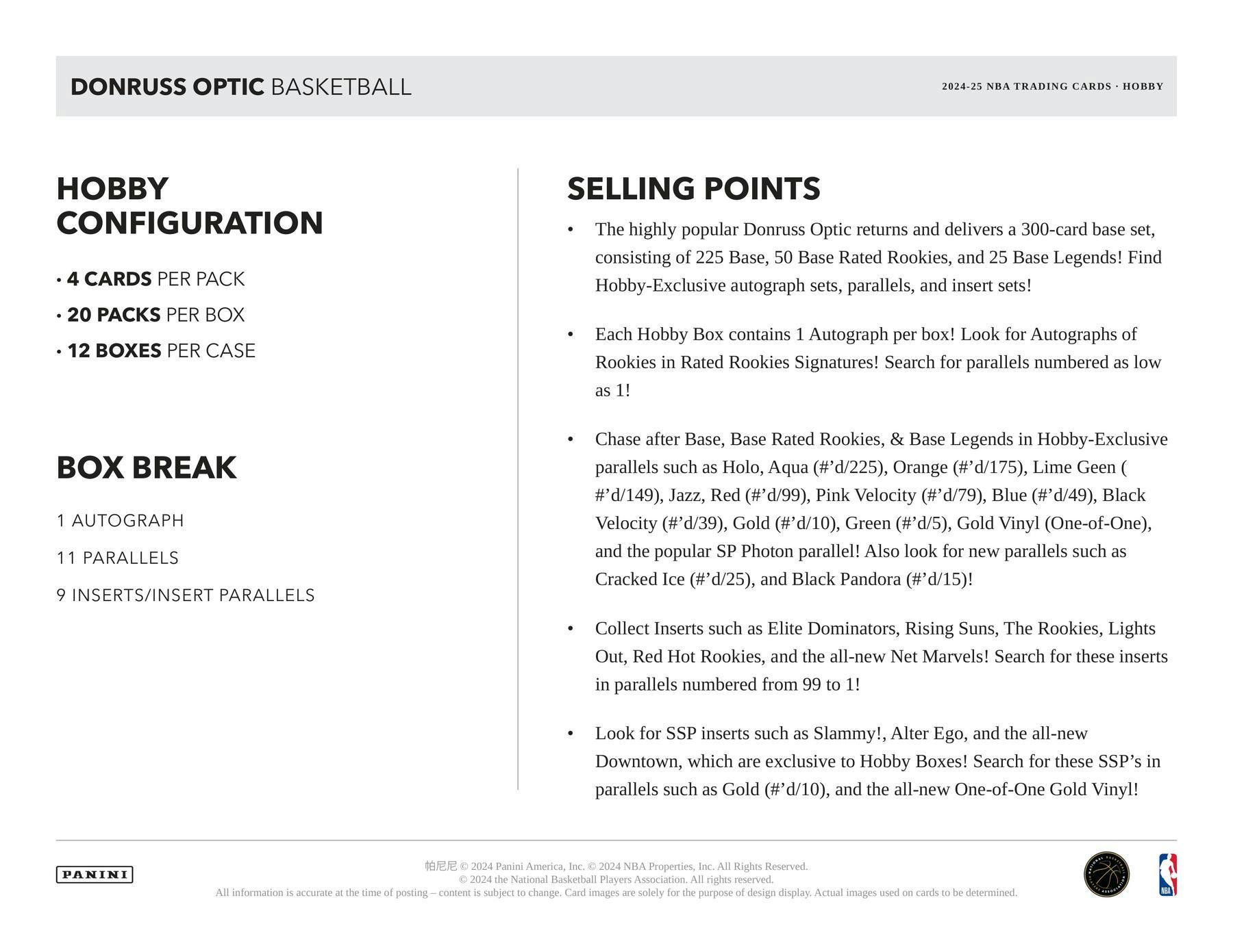 2024/25 Panini Donruss Optic Basketball Fast Break Box delivers exclusive parallels, autographs, and inserts for collectors and NBA fans alike. Each box averages one autograph, twelve parallels, and six inserts/insert parallels!