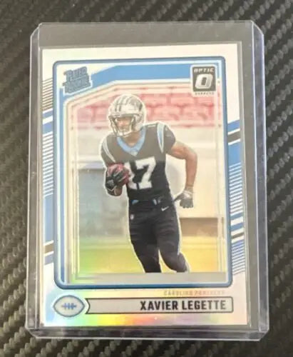 Elevate your collection with the 2024 Donruss Xavier Legette Optic Preview Holo Prizm card, a standout piece showcasing the promising talent of wide receiver Xavier Legette with the Carolina Panthers. Card #323 from the Panini Donruss set captures Legette in his rookie year, marked as a Rated Rookie, indicating his potential in the NFL. The Optic Preview Holo parallel adds a shimmering touch to this collectible, making it a dazzling addition to any football card enthusiast's array.
